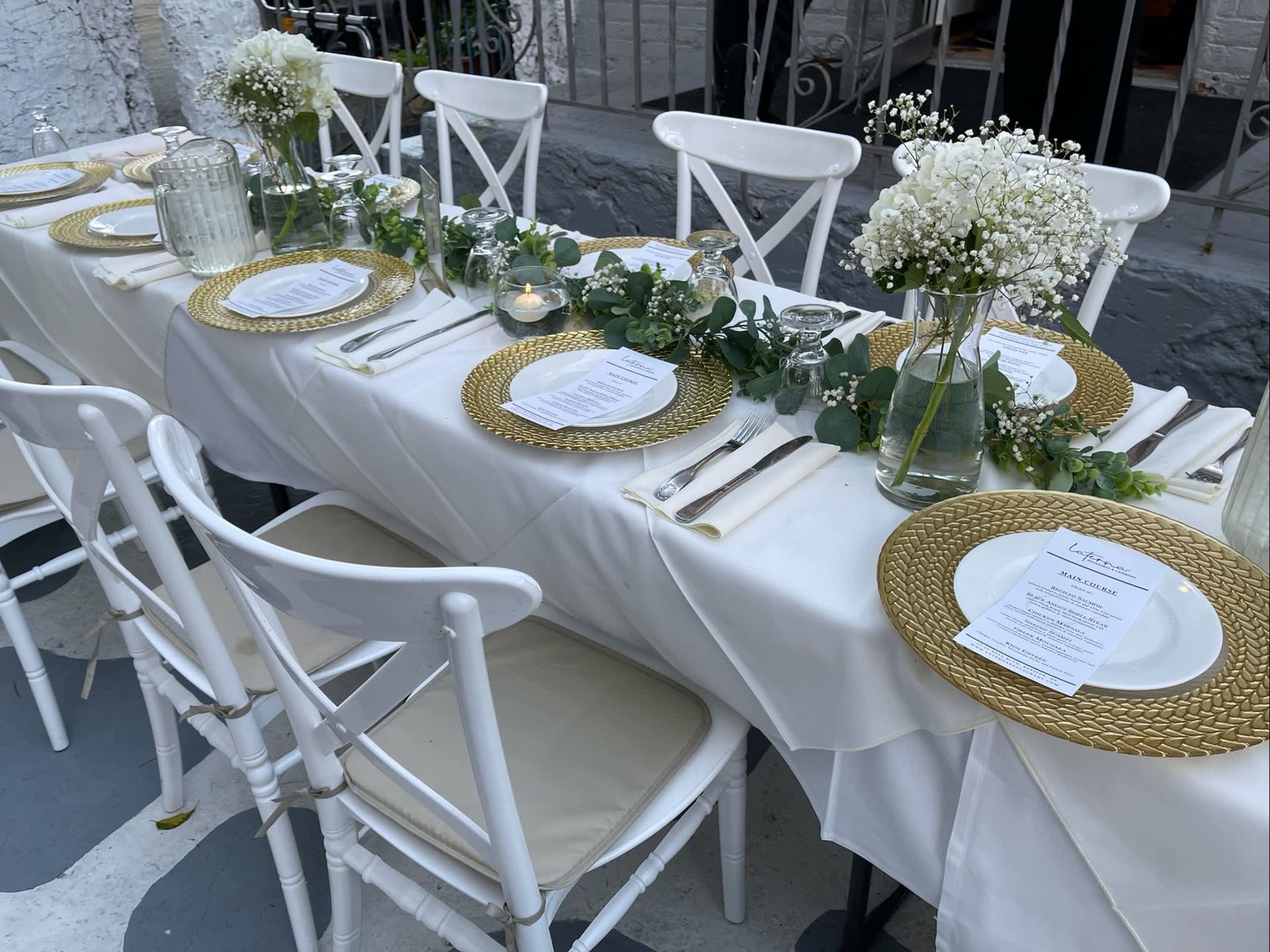 A guest favorite, our Mykonian Garden transports you straight to the Greek islands without leaving New York. This covered outdoor oasis captures the authentic charm of a traditional Mykonos courtyard, offering a unique al fresco dining experience that accommodates up to 100 guests for an unforgettable Mediterranean celebration.